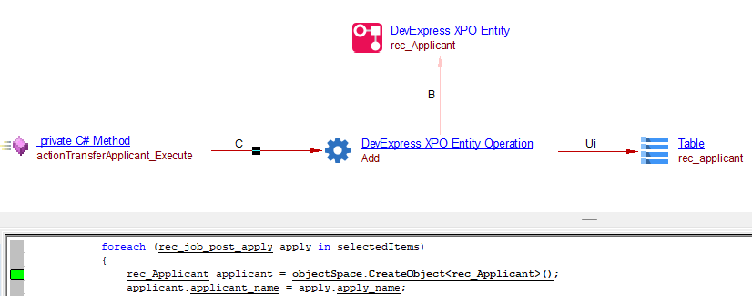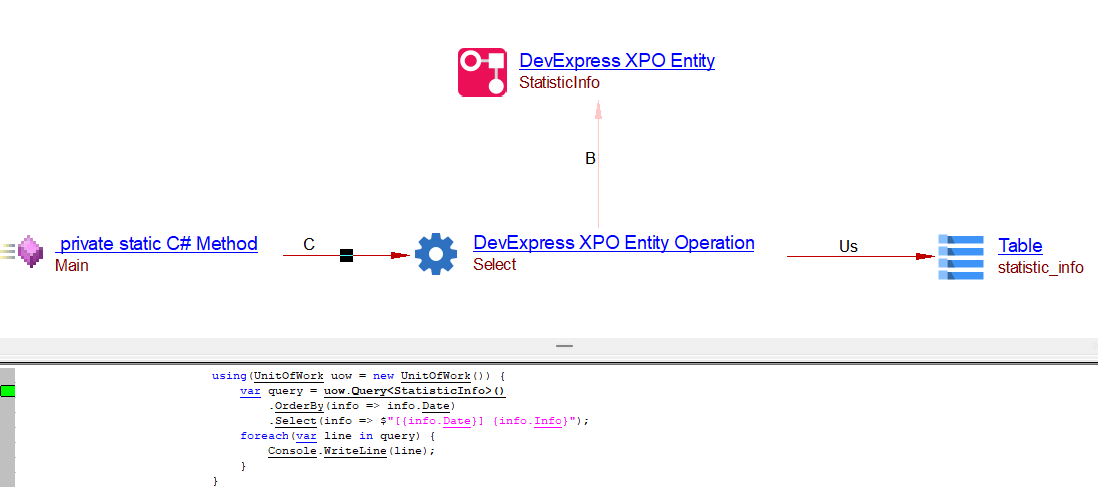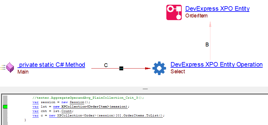 This extension should be installed when analyzing a .NET project that uses DexExpress XPO persistence framework, and you want to view CRUD transactions of the XPO persistent objects. Links to corresponding SQL database tables can also be resolved, provided that the SQL database has been extracted and DDL has been created.