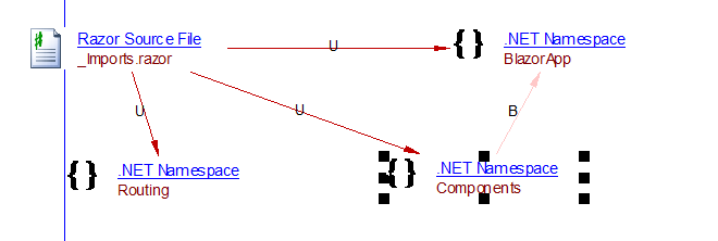 A Blazor component will use all the namespaces referenced in the _Imports.razor files in its hierarchical tree. The analyzer will create an includeLink from the component file to the import file: