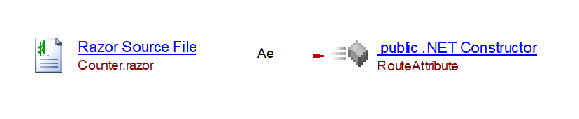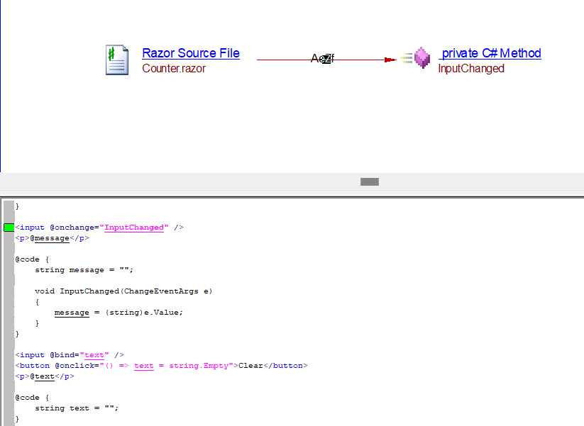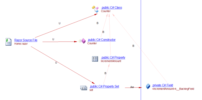 The analyzer will create an accessExecLink link from the razor file to both the constructor of the C# class Counter and to the setter of the IncrementAmout property. It will also create a relyonLink to the C# class Counter: