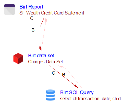 BIRT data sets can be defined in any report or library. They may define an access to a database or .CSV through SQL code. Data sets may be called from any object through call links.