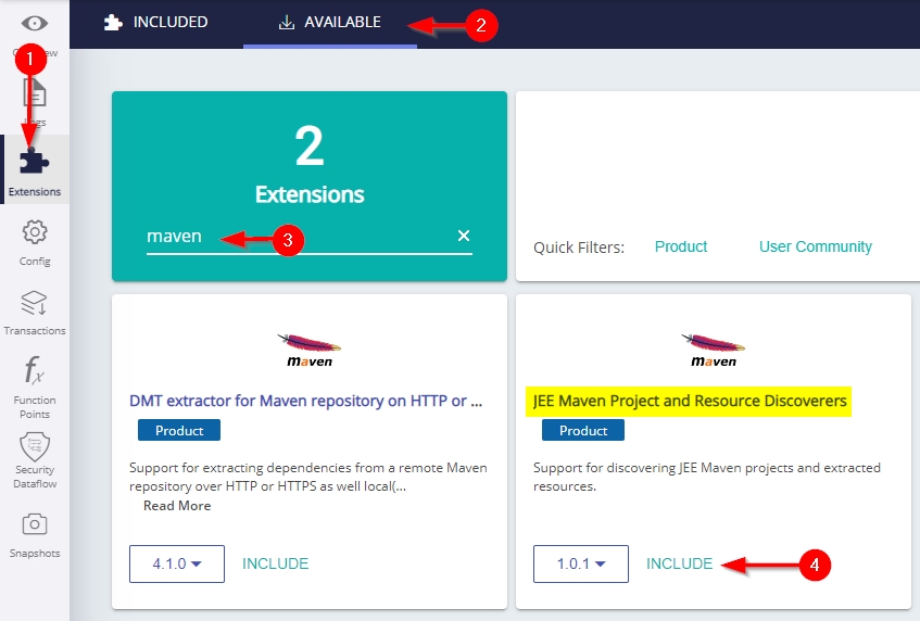 When using Console ≥ 2.7, this extension will be automatically downloaded and installed when JEE Maven source code is delivered for analysis. In all other situations, this extension will not be downloaded and installed automatically, and instead the JEE Maven discoverer embedded in AIP Core on the Node will be used. If the extension is required in this situation, it should be downloaded and installed manually: