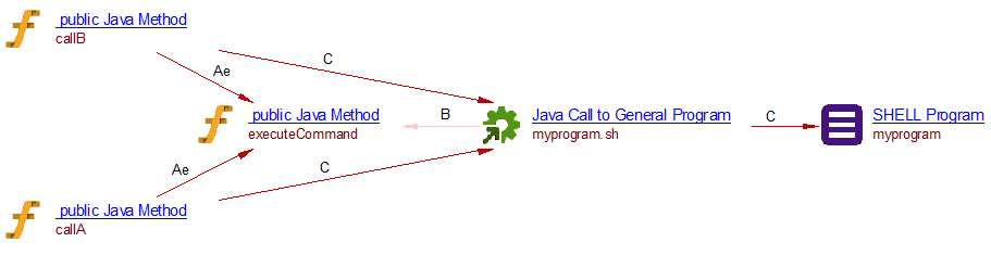 The Java Call to Program object belongs to the method containing the expression invoking the command (ProcessBuilder.start(…) or Runtime.exec(…)), in this case the method executeCommand. The callers to the Java Call to Program represent the methods from where the parameters of the (usually parameterized) invocation have been determined. In the figure above we can seen the two different call links (C) from methods callA and *callB *that correspond to two different values of the argument passed to the myprogram.sh script (option1 and option2). The list of all unique full command lines associated to a given Java Call to Program object can be found in the “Full command lines” property: