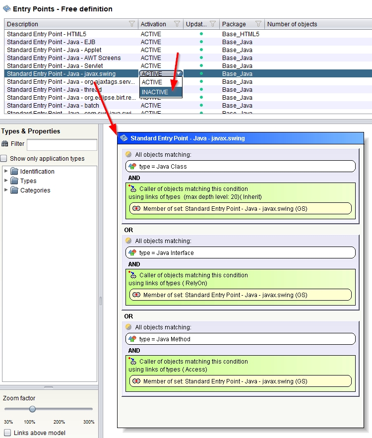 Note that the JEE Analyzer extension also provides Java Swing transaction entry points and these overlap with the configuration provided in the Java Swing extension. CAST recommends disabling the Java Swing transaction entry points provided by the JEE Analyzer extension on a case by case basis, where conflicting results are produced.