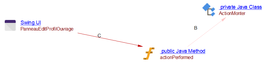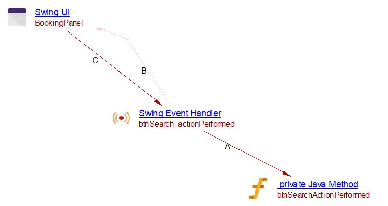 In some cases, when a call to a swing listener method as “actionPerformed” for example is too difficult to find precisely (through addActionListener), a post application procedure is done with a specific algorithm searching for calls to constructors of these listener classes. Then a link to the method can be created.