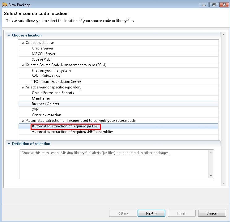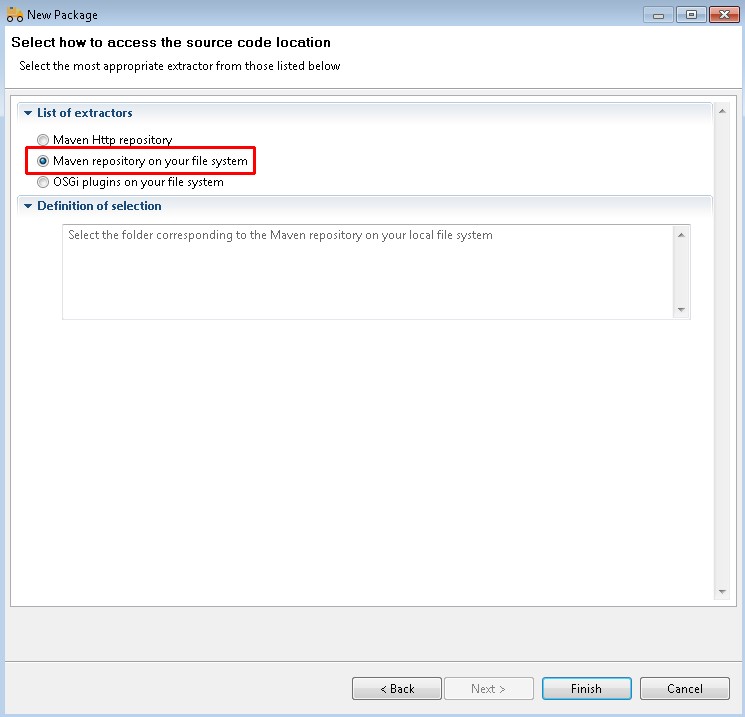 The DMT extractor for Maven local repository provides the means to extract (using the CAST Delivery Manager Tool) JAR based source code from a local Maven repository. In other words, JAR based source code that resides in a simple local or network folder. This extractor should be used when you want to extract JAR based source code that is stored in a local Maven repository. For example, when your JEE application relies on JAR files and the initial extraction of this application in the CAST Delivery Manager Tool throws “missing library file” alerts, you can use this extractor to extract the missing files from a local Maven repository and resolve the alerts.