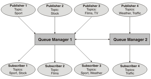 The producer of a message is known as a publisher and message consumers are known as subscribers. The publishing and subscribing applications within the infrastructure agree on the name of a topic. For a consumer to signal that they want to receive messages on that topic, they create a subscription to it. Any message published to a topic will be delivered to all the subscriptions, so every subscriber gets a copy. There could be many publishers and many subscribers to each topic, MQ handles the delivery of messages between all of them. For example: