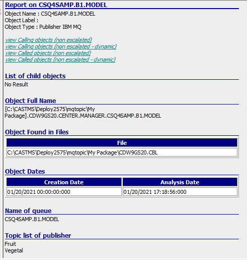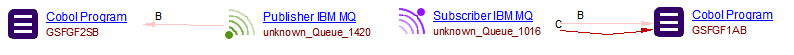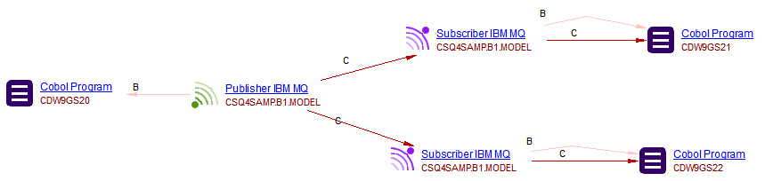 The Mainframe Analyzer supports the publisher/subscriber mode and point-to-point mode for IBM MQSeries. Publisher/Subscriber objects will be generated and Call links between Cobol objects and IBM MQ objects and between IBM MQ objects and Cobol objects will be generated by the Web Services Linker extension - you must ensure that v. ≥ 1.6.8 of this extension is installed, otherwise no links will be generated.