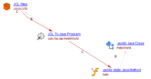 The Mainframe Analyzer extension supports links from JCL Steps to Java Methods through the creation of a JCL_To_JavaProgram object. The JCL_To_JavaProgram object is created when the following utilities are detected in the code: