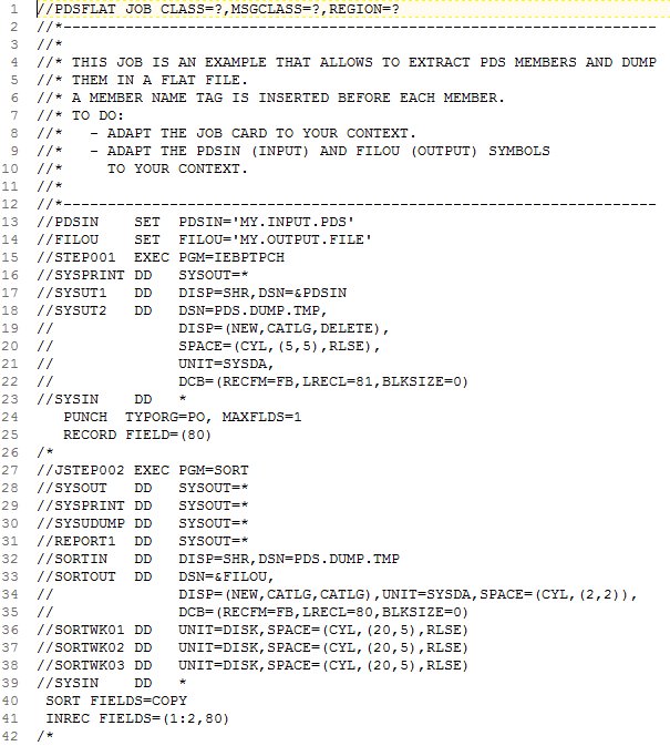 It is possible to dump the content of a PDS in a flat file where each member is preceded by a specific banner. This operation is performed by executing a dedicated tool (IEBPTPCH ) through a JCL job (you can download this file here (note this is a ZIP file that contains the JCL file)). The resulting file can be then transferred onto the analysis server ready for delivery via the Delivery Manager Tool.