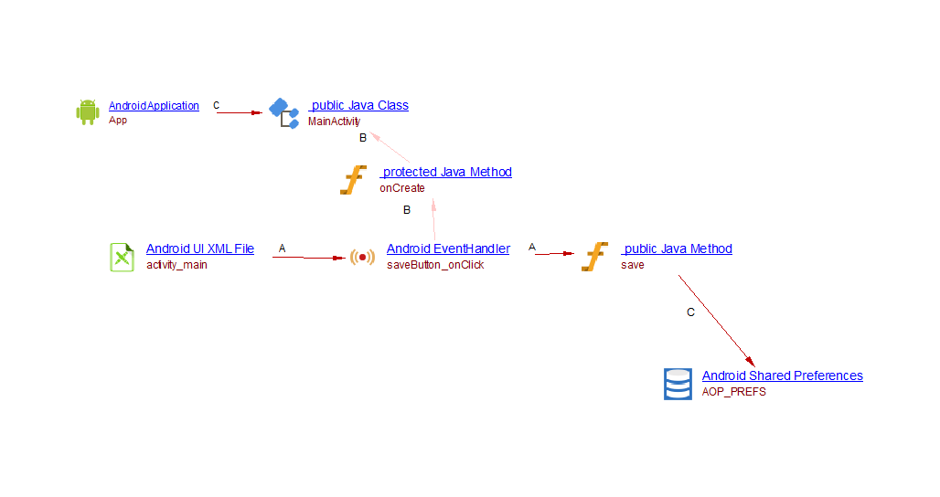 This file will be analyzed to understand whether the application is indeed an Android application. Some objects (exposed service/activity/receiver) are created under the manifest to represent exposed services. Then links are created from these services to the methods which are listeners of these services.