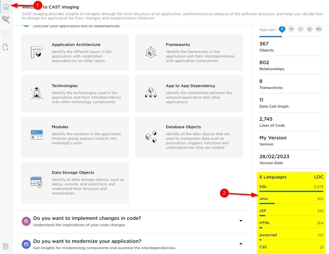 Information is made available in CAST Imaging ≥ 2.16 in the Welcome Page. Lines of Code (LOC) values are displayed for each Language found in the delivered source code: