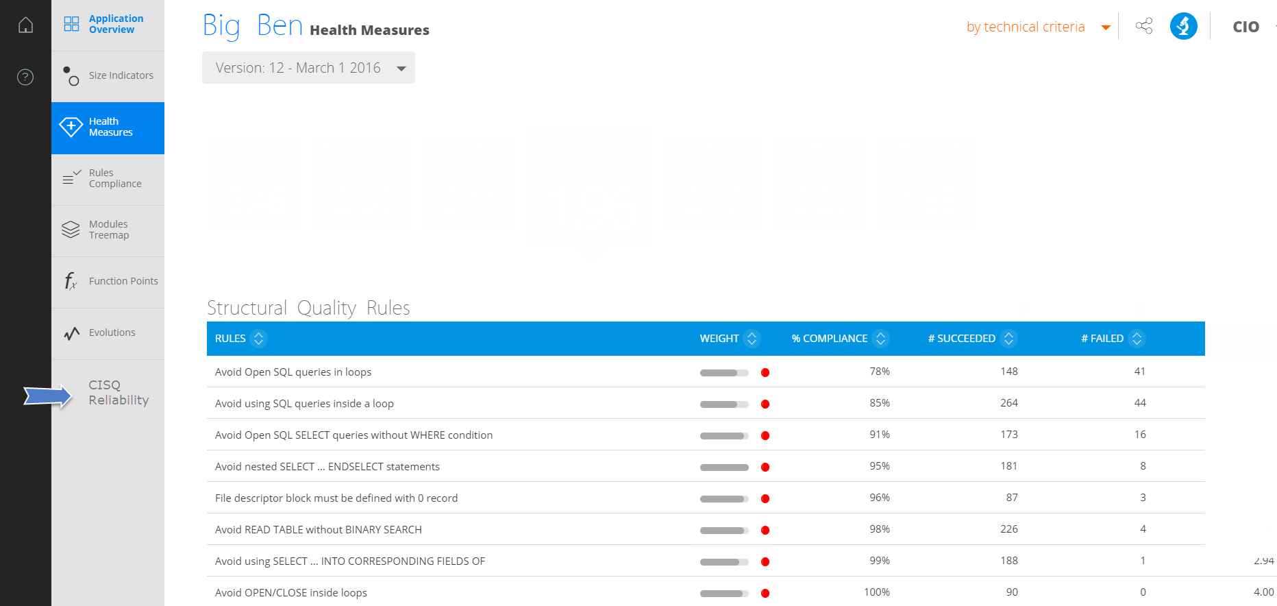 To view the new tiles, refresh your browser. If you do not see the tiles, you may need to empty your browser cache. The tiles will be displayed as follows (example for the CISQ-Reliability tag in the CAST Health Dashboard):
