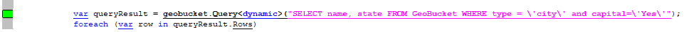 var queryResult = geobucket.Query<dynamic>("SELECT name, state FROM GeoBucket WHERE type = \'city\' and capital=\'Yes\'");