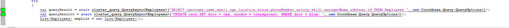 var queryResult2 = await cluster_query.QueryAsync<Employees>("UPDATE cars SET door = red, window = transparent, WHERE door = blue; ", new Couchbase.Query.QueryOptions());