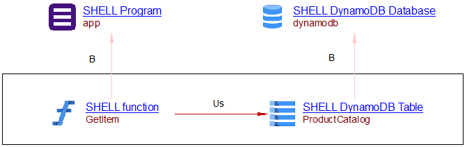 As a result, a Shell AWS DynamobDB Table is created after the reference to the table, together with a parent Shell AWS DynamoDB Database objet. A link is also created of type useSelectLink between the caller GetItem function and the table.