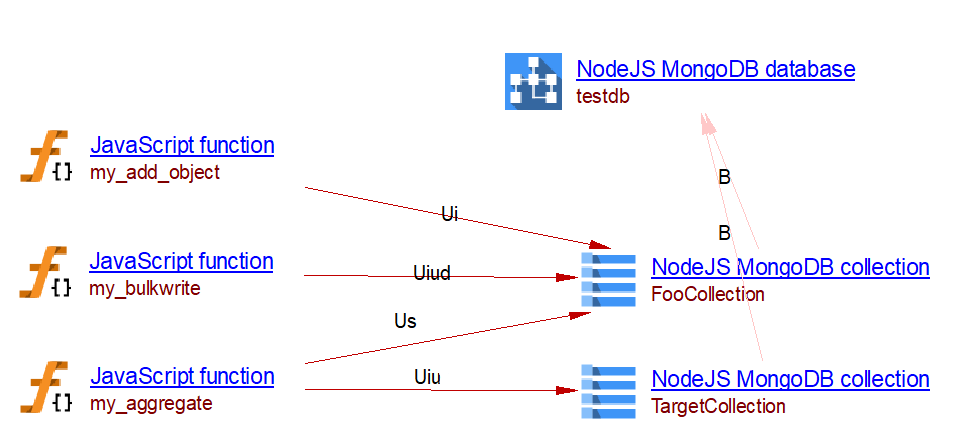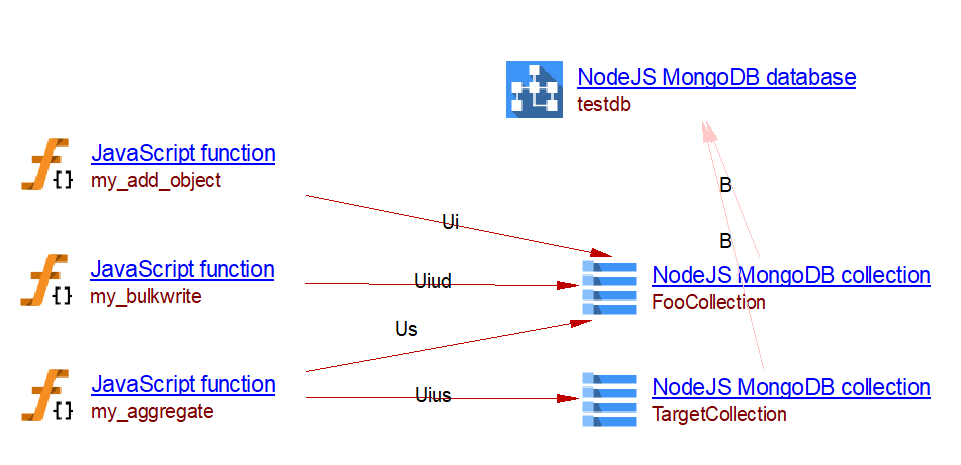 In this example, a ‘NodeJS MongoDB connection’ and a ‘NodeJS MongoDB collection’ objects are created. This extension creates a useInsert link from function ‘insertDocuments’ to the collection ‘documents’ and a useUpdate link from function ‘updateDocument’ to the collection ‘documents’:
