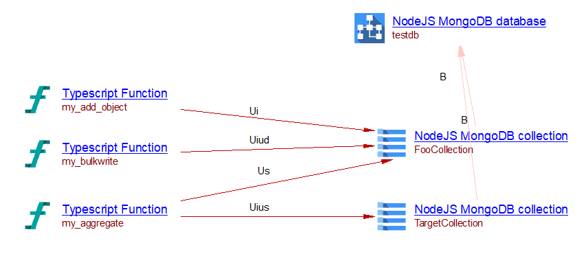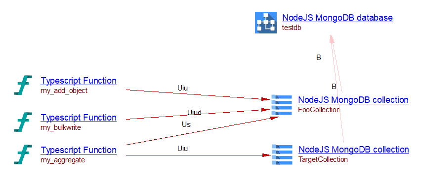 In this example, a ‘Node.js MongoDB connection’ and a ‘Node.js MongoDB collection’ objects are created. This extension creates a ‘useSelect’ link from function ‘Anonymous1’ to the collection ‘docs’: