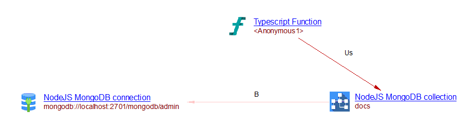 In this example, a ‘Node.js MongoDB connection’ and a ‘Node.js MongoDB collection’ objects are created. This extension creates a ‘useSelect’ link from function ‘Anonymous1’ to the collection ‘docs’: