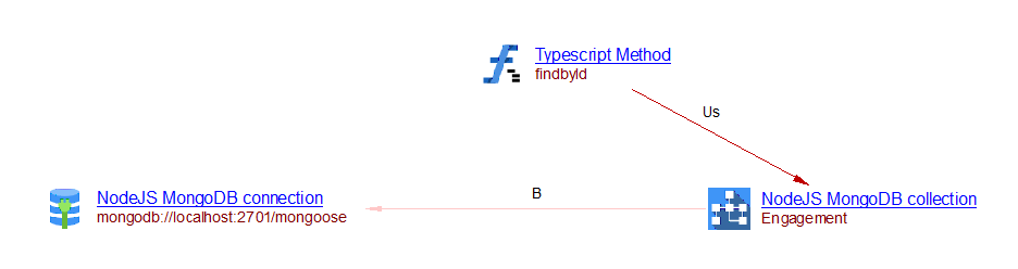 In this example, a ‘Node.js MongoDB connection’ and a ‘Node.js MongoDB collection’ objects are created. This extension creates a ‘useSelect’ link from method ‘findbyId’ to the collection ‘Engagement’: