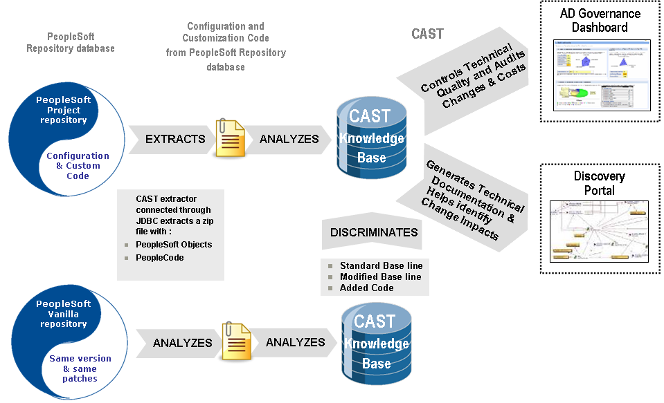 The image below describes the entire process of computing quality assessments of PeopleSoft projects, from the extraction of the PeopleSoft source code and meta-data to the integration of the quality results into the CAST dashboards.