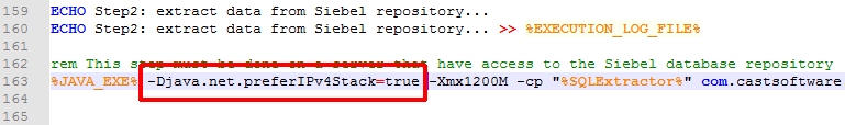 The workaround to this issue involves manually adding a specific Java runtime option (-Djava.net.preferIPv4Stack=true) and then attempting to rerun the database extraction. Add the specific Java option to the Siebel-Extract-CLI.bat batch file at line 163, immediately after %JAVA_EXE%: