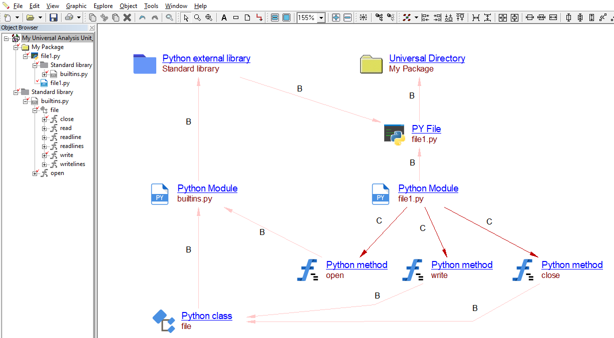 The objects corresponding to the code of the file1.py file are inside the Universal Directory root object. Additionally the analyzer will automatically generate a Python external library object representing the Python Standard Library. Within this, the Python built-in library is abstracted as a Python source code object named builtins.py, with its corresponding open function and file class (abstracting general file-like objects) that contains the above mentioned methods. No differences are considered between Python2 and Python3 built-in functions. Notice the external character of these objects denoted by gray-shaded icons in the left Object Browser panel.