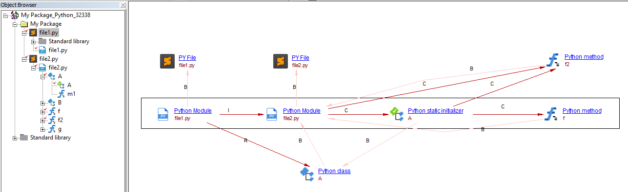 The statements of a given class code block are represented by an *effective Python Static Initializer *object. In this object other class and method definitions are not included. Class docstrings are excluded from this object. This particular code is executed at class-definition time. To represent this in the call-graph, a link between the enclosing Python Module (or Python Method when the class is defined inside a method) and the Static Initializer object as shown in the example below: