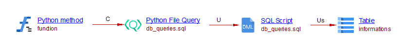 In this situation, the analyzer will create a Python File Query object with the name of the sql file. This object will make the link between the method containing the query and the SQL script (if it is present, and dependencies between SQL and Python are configured as previously mentioned), so that the end point of the transaction (for example, a table) can be reached.