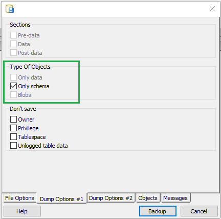 - schema-only : this will dump only the object definitions (schema), not data