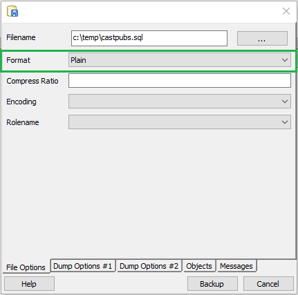 - format plain : this will output a plain-text SQL script file