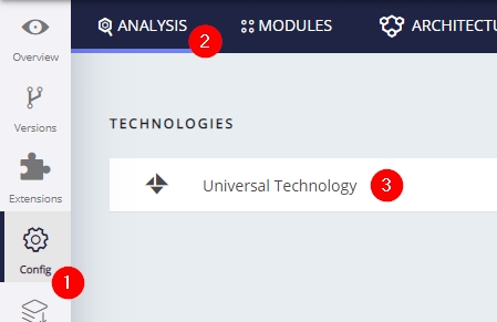 AIP Console exposes the technology configuration options once a version has been accepted/imported, or an analysis has been run. Click Universal Technology (3) in the Config (1) > Analysis (2) tab to display the available options for your TIBCO source code: