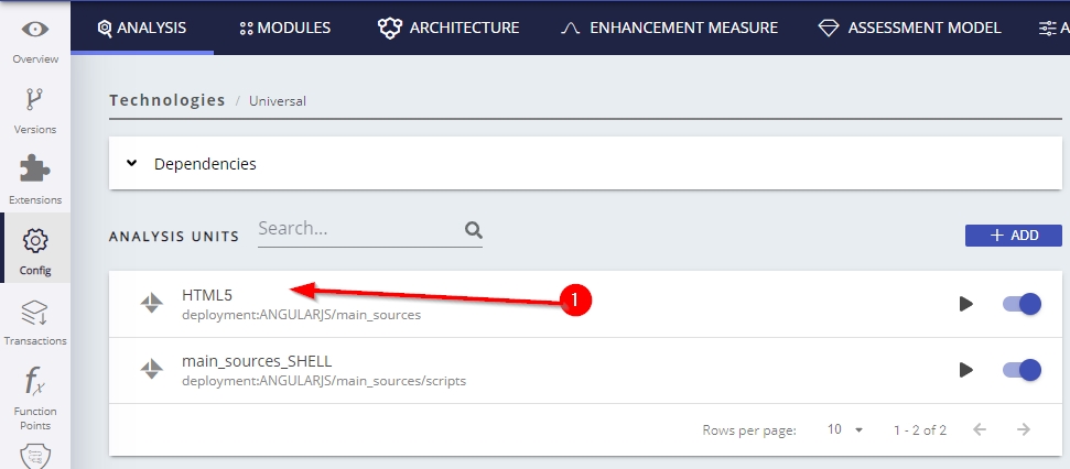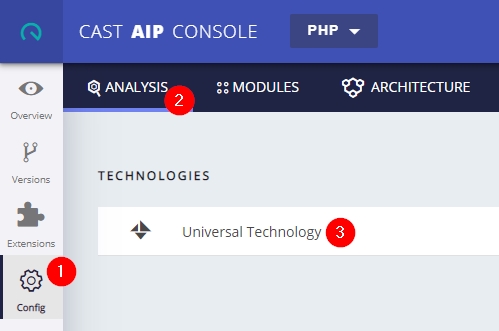 CAST Console exposes the technology configuration options once a version has been accepted/imported, or an analysis has been run. Click Universal Technology (3) in the Config (1) > Analysis (2) tab to display the available options for your AngularJS source code:
