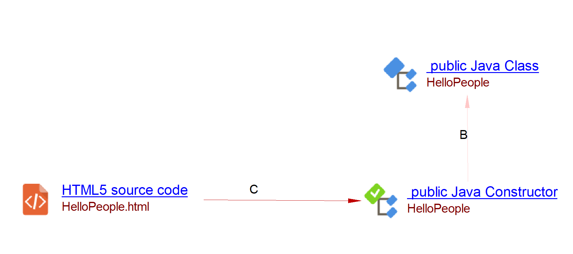 Java classes can contain multiple Java Constructors. In this situation, the extension will produce a callLink from the HTML5 source code object to each of the explicitly defined Java Constructors objects as follows:
