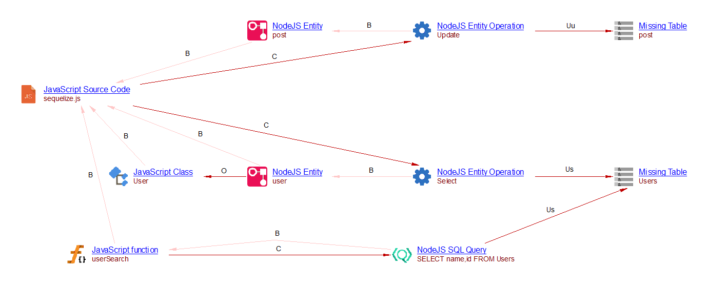 In this example, two ‘NodeJS Entity’ objects, two ‘NodeJS Entity Operation’ objects, and a ‘NodeJS SQL Query’ object are created. A ‘relyOn’ link is added when entity ‘user’ is defined using a class extending ‘Sequelize.Model’. The SQL Analyzer or Missing tables and procedures for Node.js links these entity operations and this query with the corresponding tables. In the present case, this extension creates two ‘useSelect’ and a ‘useUpdate’ links to the missing tables ‘Users’ and ‘post’:
