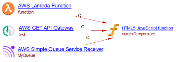 The Lambda function has a Nodejs runtime and the handler function is given by the handler function fullname. If the Lambda function is deployed using a supported deployment framework (such as CloudFormation ), the extension will create a Lambda function, an SQS receiver, and an API Gateway object. Each of these objects has a runtime property (Node.js) and a handler property with the function fullname. If the extension finds a JavaScript function matching the handler fullname, a link to that function will be added from the Lambda function, the SQS queue and the API Gateway object: