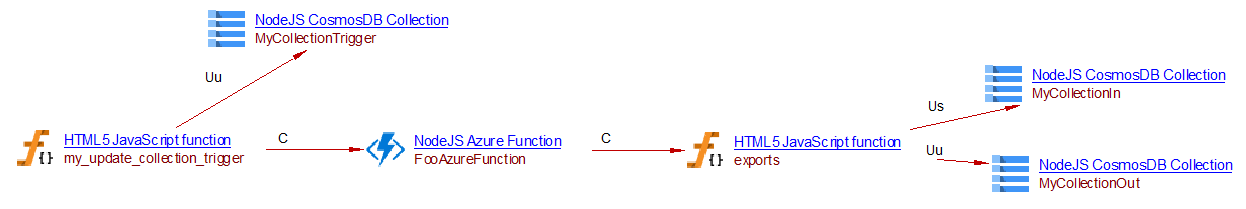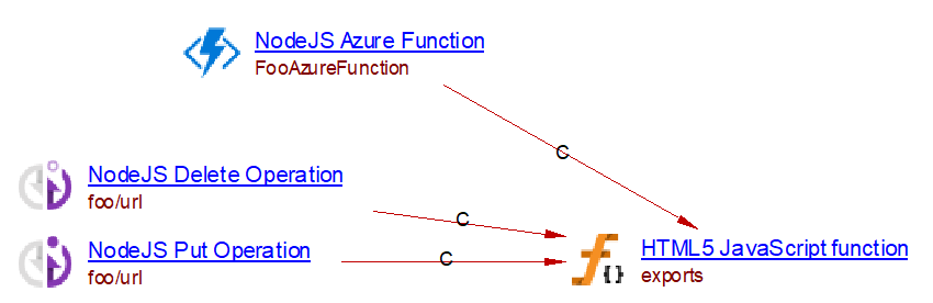 Whenever an Azure Function is found in the analyzed source code, an Azure Function object is created with a callLink to the JavaScript handler function. Note that if the handler function is defined in a TypeScript file, this extension will create the Azure Function with a callLink to the TypeScript handler function only if the com.castoftware.typescript extension is used.