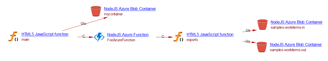 - When the bindings section of the function.json file contains one item of type “blob” with a direction “in” (resp. “out”), a blob container is created with a useSelect (resp. useUpdate) link from the handler function to the blob container. The name of the container is given by the beginning of “path”.