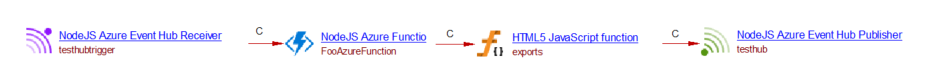 - When the bindings section of the function.json file contains one item of type “eventHub” with a direction “out”, a Azure Event Hub Publisher is created with a call link from the handler function. The name of the queue is evaluated from the “eventHubName” value.
