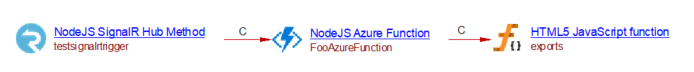 When the bindings section of the function.json file contains one item of type “signalRTrigger”, a NodeJS SignalR Hub Method is created with a call link to the handler function. Its name is evaluated from the “event” value. It has a hub name property evaluated from the “hubName” value. For example, when analyzing the following source code: