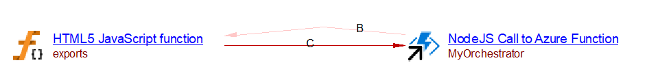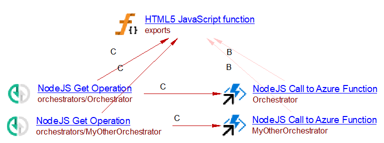 The startNew method from the “durable-function” client allow the client function to call an orchestrator function. The callActivity method from the “durable-function” package allows calling an activity function. Whenever one of these method calls is found in a JavaScript source code, a call to Azure Function object is created. The name of the object is evaluated from the first argument of the call. If an Azure Function object with the same name exists, a call link from the call to the Azure Function to that matching Azure Function is created.