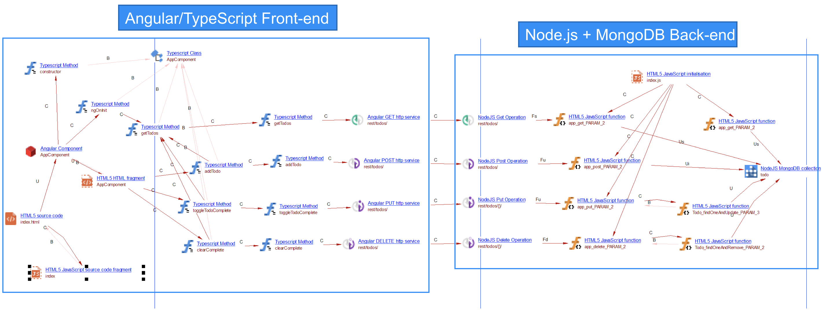 In this full-stack example, the front-end is implemented in TypeScript and uses Angular and the back-end is implemented in JavaScript and uses Express and MongoDB. If analyzing a web-application with the back-end implemented in TypeScript, the data-base access would be missing since this extension does not yet support any database access framework.