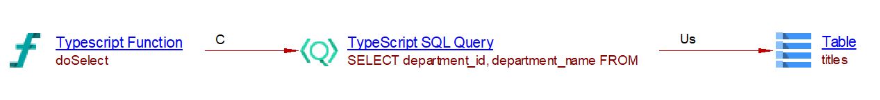 In this example, a ‘TypeScript SQL Query’ object is created and a callLink between the anonymous function and that query is added. The SQL Analyzer can then link that query with the corresponding table if the table exists. In the present case, this extension creates a useSelect link to the table ’titles’: