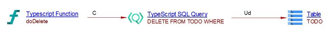 In this example, a ‘TypeScript SQL Query’ object is created and a callLink between the anonymous function and that query is added. The sql analyzer can then link that query with the corresponding table if the table exists. In the present case, this extension creates a useDelete link to the table ‘TODO’: