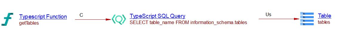 In this example, a ‘TypeScript SQL Query’ object is created and a callLink between the getTables method and that query is added. The SQL Analyzer can then link that query with the corresponding table if the table exists. In the present case, this extension creates a useSelect link to the table ’tables’: