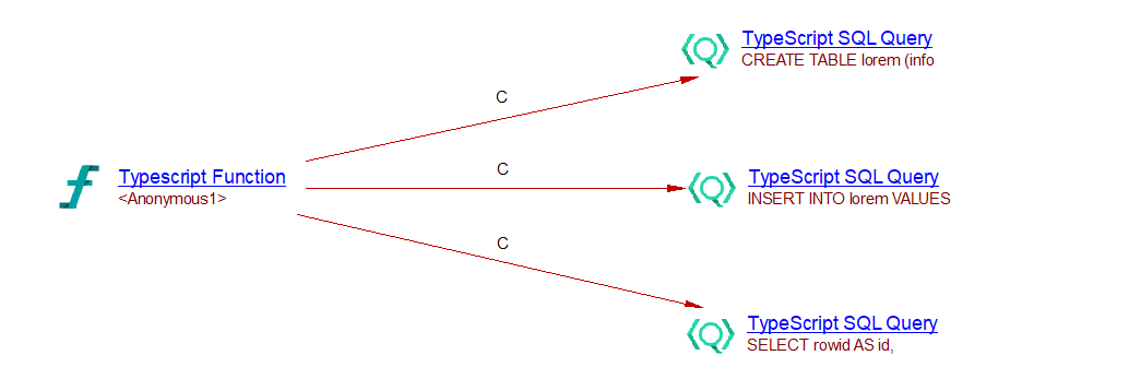 In this example, three ‘TypeScript SQL Query’ objects are created and three callLink between the anonymous function and these query are added. The SQL Analyzer can then link that query with the corresponding table if the table exists: