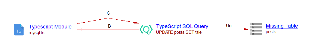 In this example, a ‘TypeScript SQL Query’ object is created and a ‘callLink’ between the ‘mysql.ts’ module and that query is added. The SQL Analyzer or Missing tables and procedures for Node.js can then link that query with the corresponding table if the table exists. In the present case, this extension creates a ‘useUpdate’ link to the table ‘posts’: