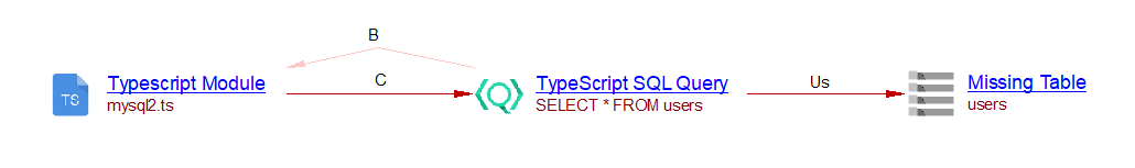 In this example, a ‘TypeScript SQL Query’ object is created and a ‘callLink’ between the ‘mysql2.ts’ module and that query is added. The SQL Analyzer or Missing tables and procedures for Node.js can then link that query with the corresponding table if the table exists. In the present case, this extension creates a ‘useSelect’ link to the table ‘users’: