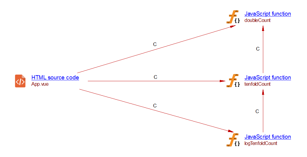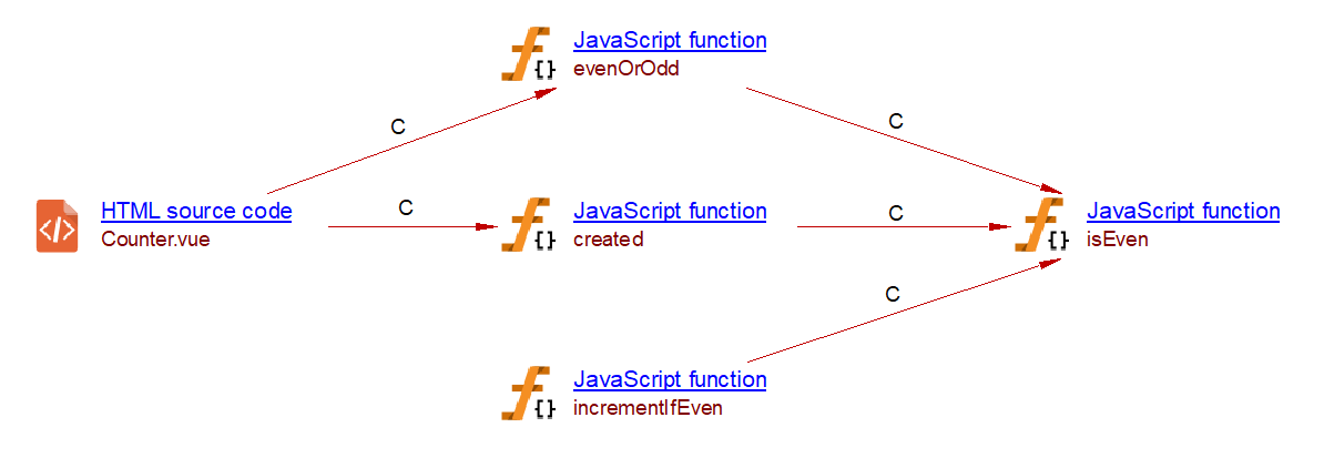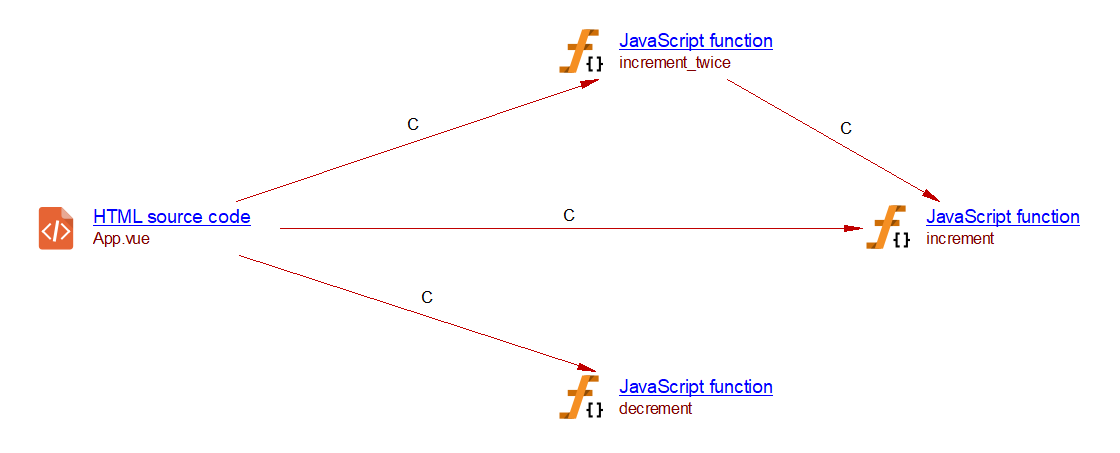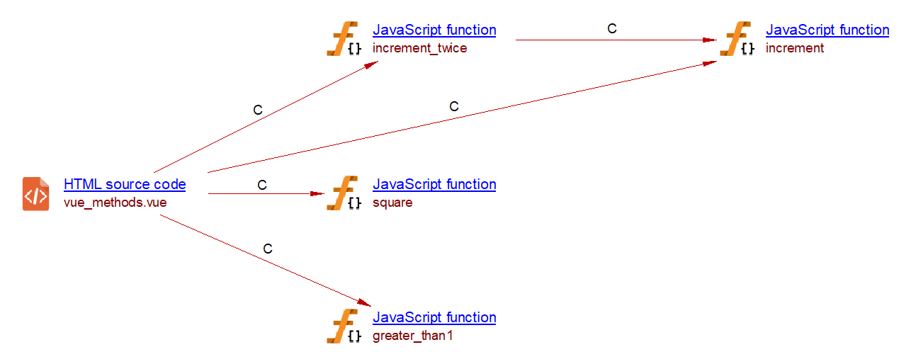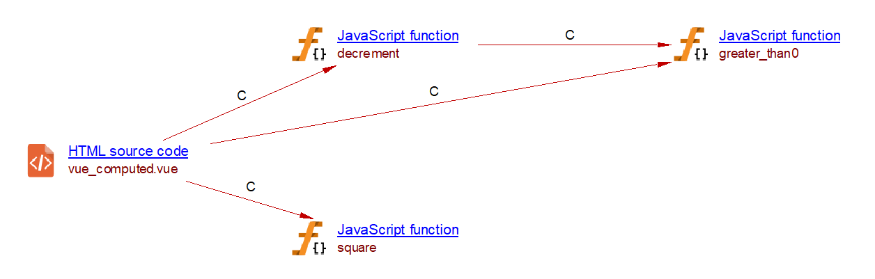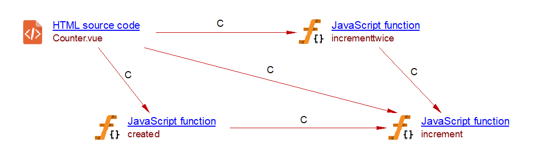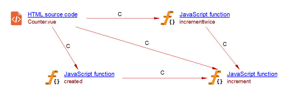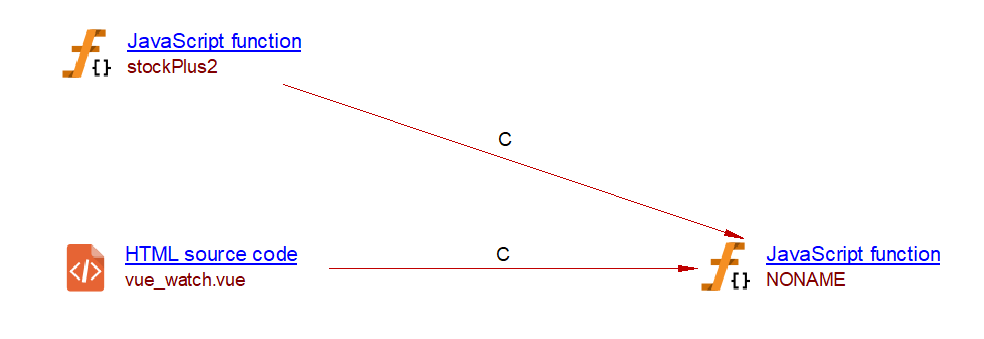 In Vue.js, a watcher function is called whenever its associated variable is modified. The com.castsoftware.vuejs extension creates a callLink to a Vue.js watcher whenever a modification of variables made with a simple assignment or using the increment (++) or decrement (–) operator. These modifications are checked within: